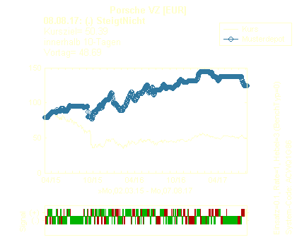 Unten: Die täglichen Prognosen bzw. Signale werden jeweils durch einen Balken (Strich) dargestellt (vereinigen sich bei gr. Anzahl grafisch zu Flächen). Die obere Reihe stellt die "Steigt"-Signale dar, in der unteren Reihe befinden sich die "SteigtNicht"-Signale.