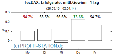 Die Studie analysiert für jeden Wochentag die Schlusskursänderung zum nächsten Tag. Als Ergebnis ergibt sich eine Erfolgsrate bzw. Wahrscheinlichkeit für einen steigenden Kurs (Prozentzahlen) und ein mittlerer Gewinn (Balken, in Prozent) zum betreffenden Wochentag.